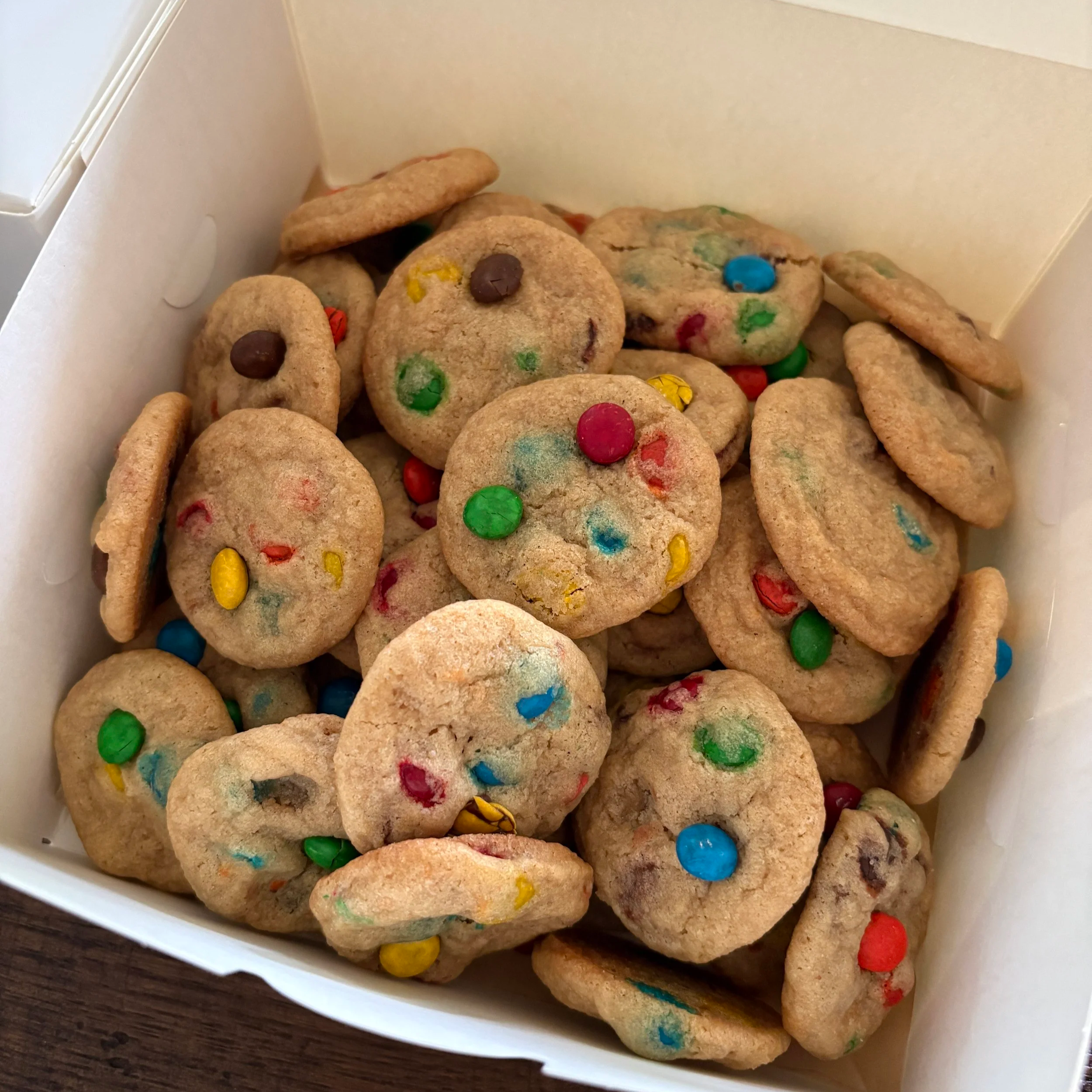 Warning: These bite-sized cookies are dangerous. It’s hard to eat just one… or two… or six! We can miniaturize any of our regular cookie flavors but our particular favorites are peanut butter and mini M&M.
